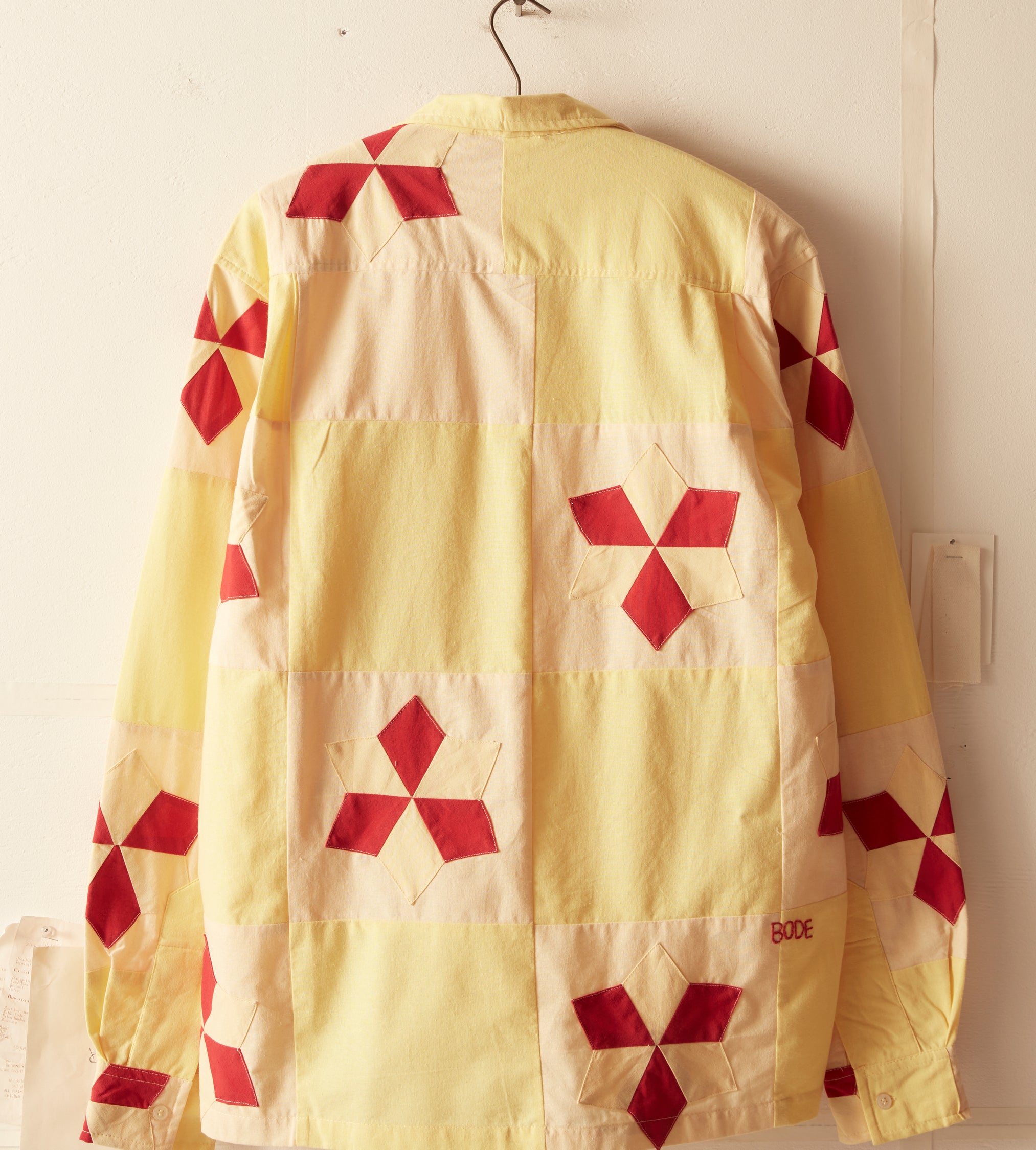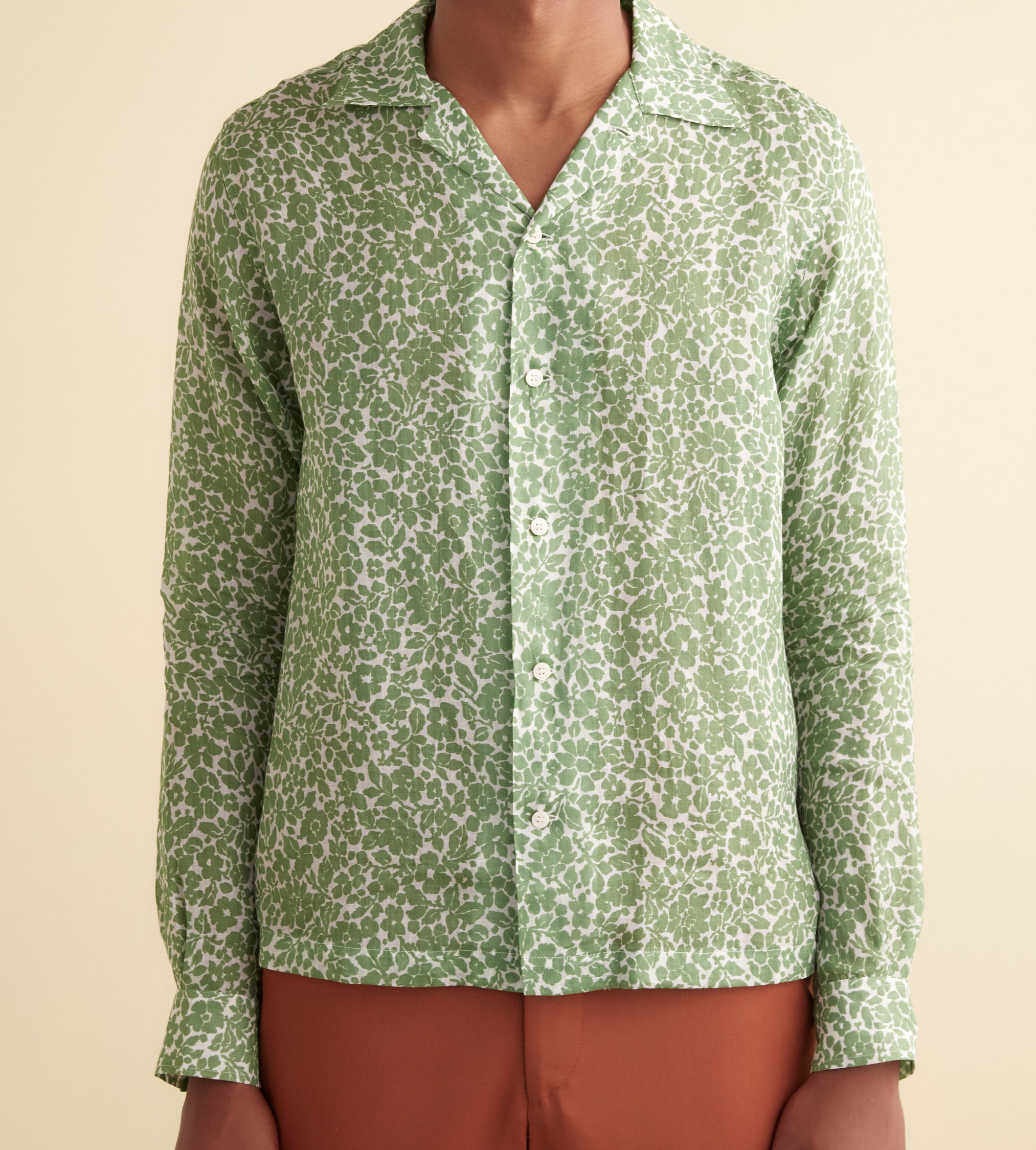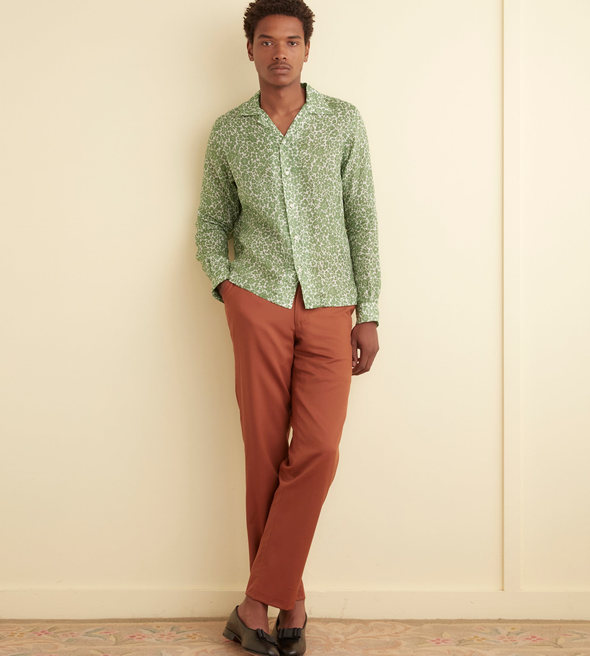 Chemise en coton gris chiné parsemé de petits cœurs kaki brodés en jacquard. La coupe over-size s’inspire des chemises d’homme.