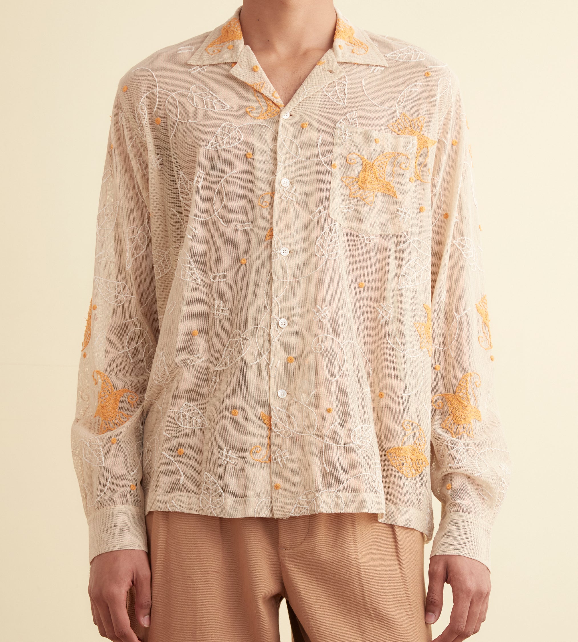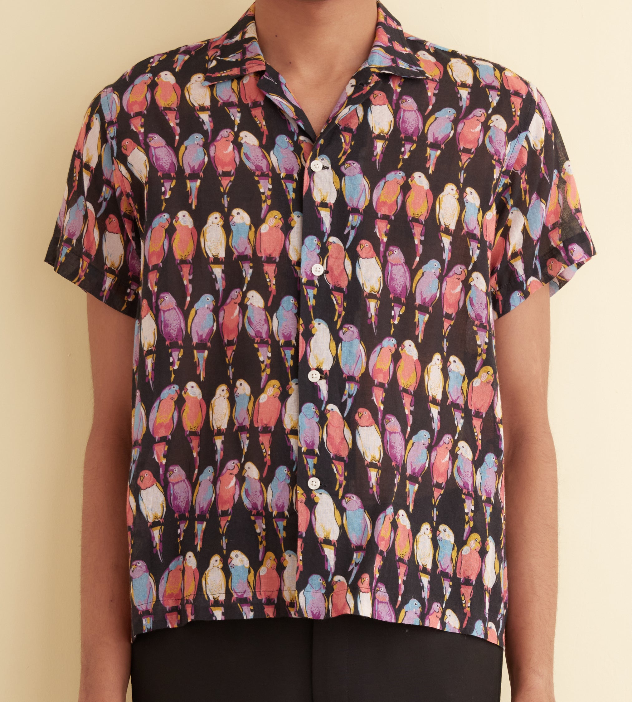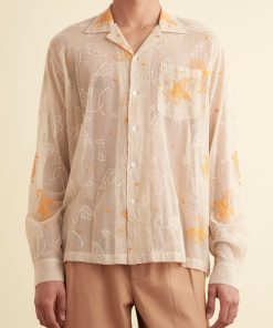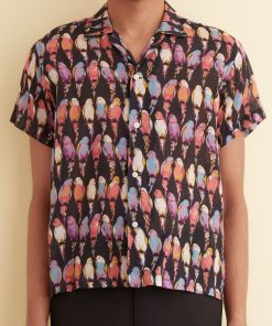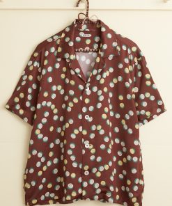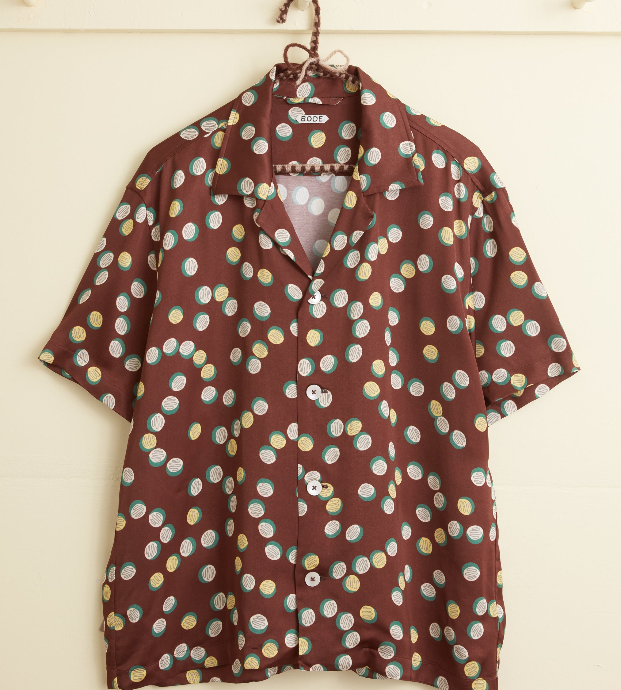 Veste en fourrure synthétique grège imprimée de grosses pommes noires.