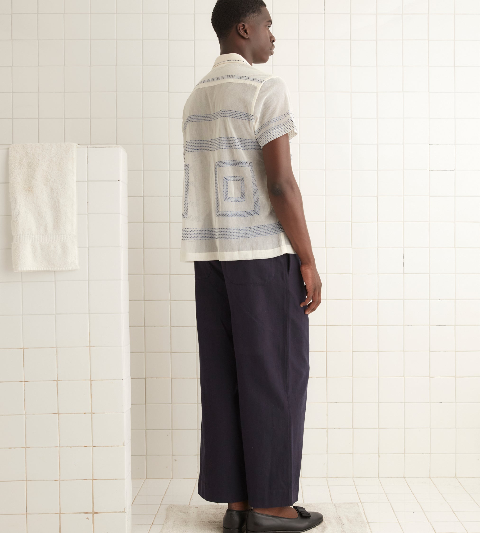 Banane en velours de coton bleu parsemé en all-over de marguerites bleu foncé. Elle est ornée de deux petites oreilles de chat qui écoutent et gardent secrètes les confidences qui lui sont faites.