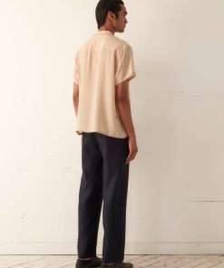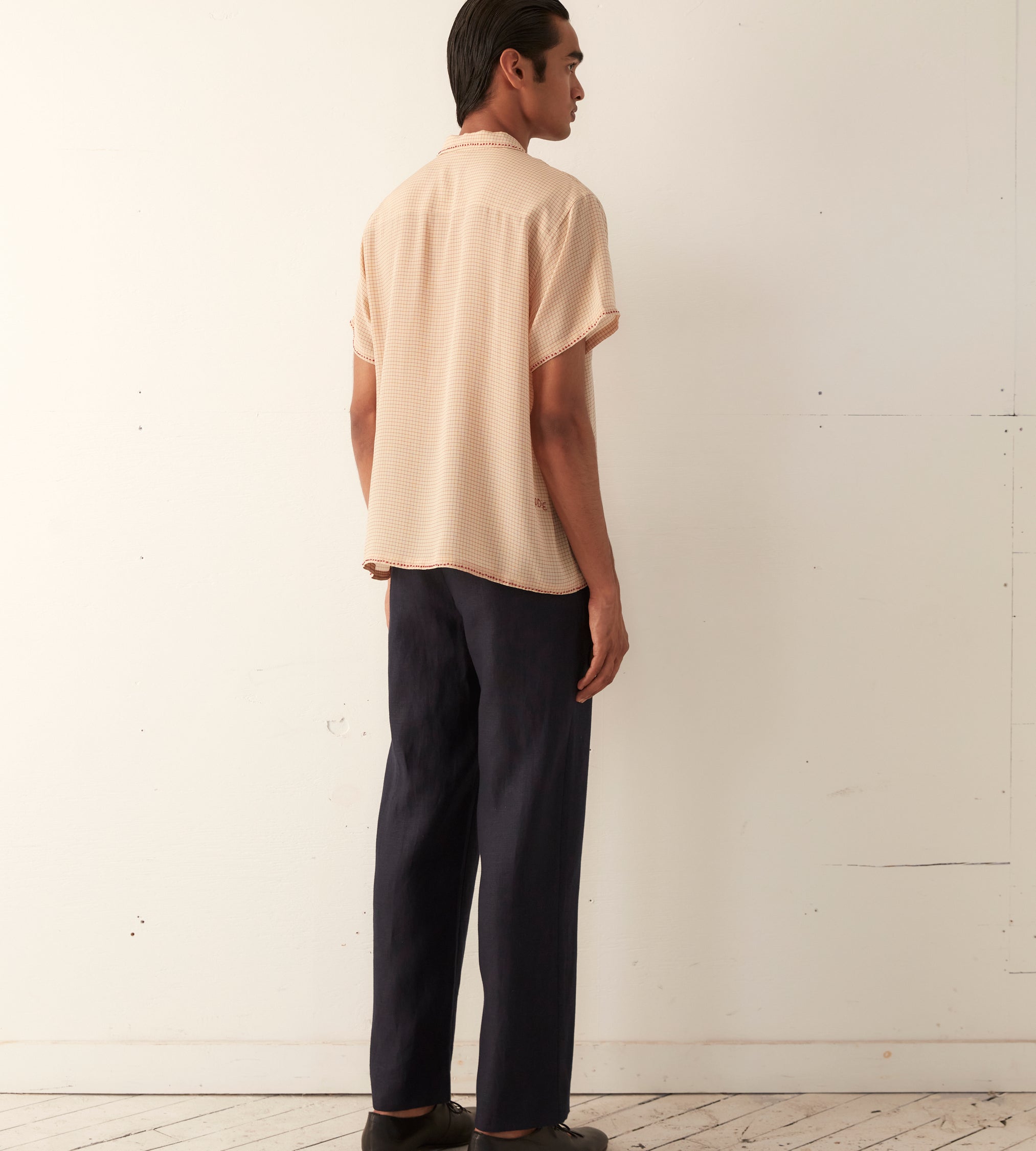 Blouse en coton écru brodée de motifs floraux rose et vert.