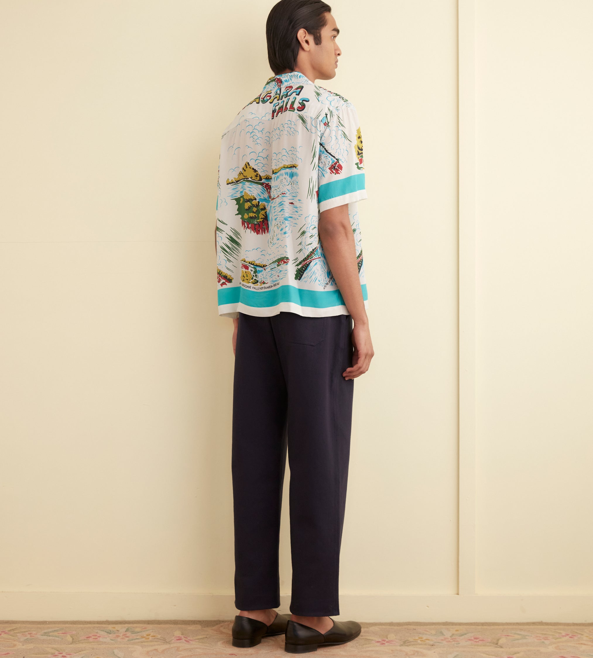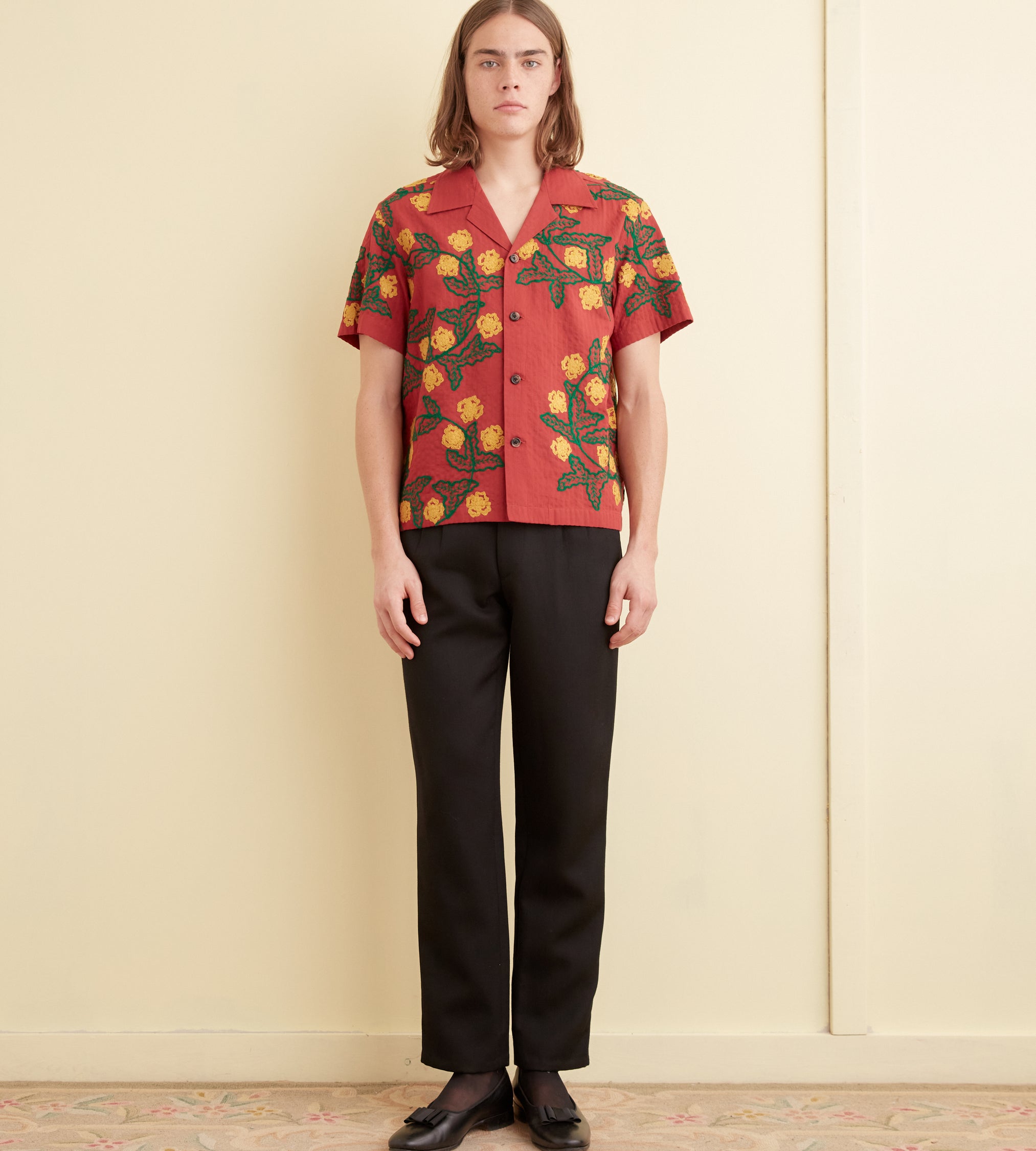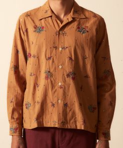 Blouse en coton ornée de fleurs bleues sur fond écru.