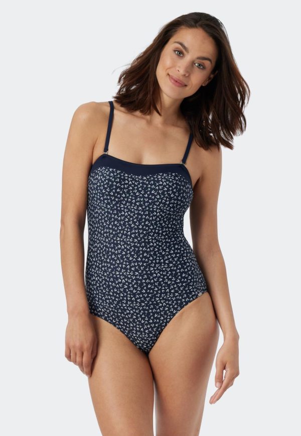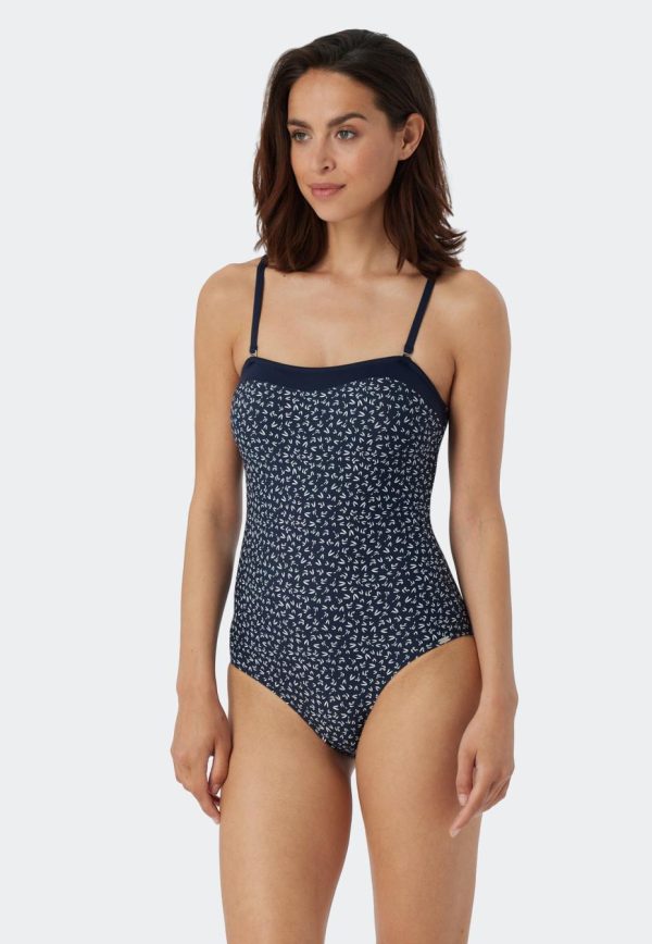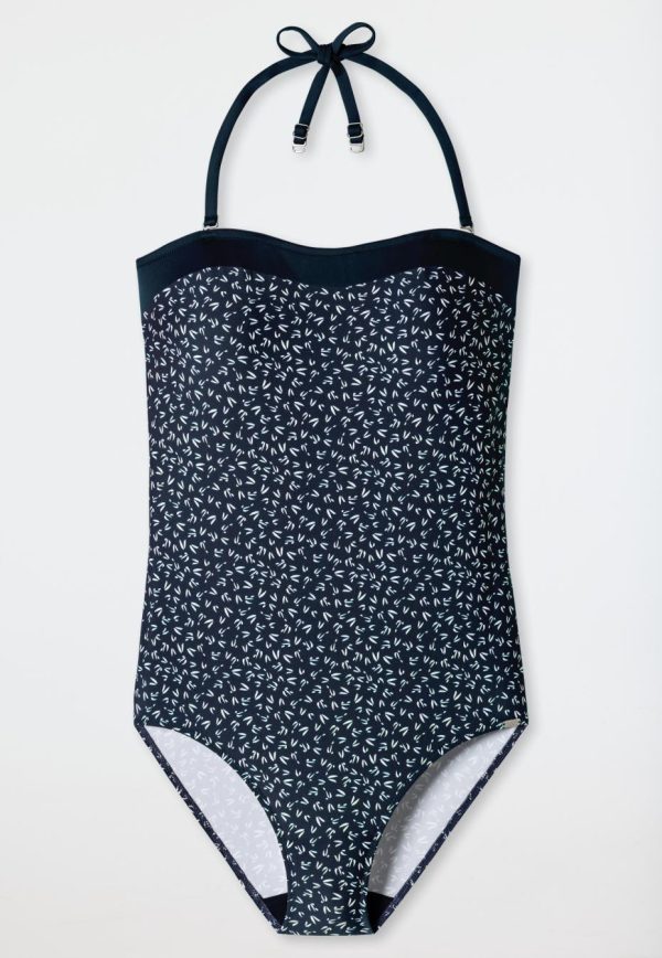 - dunkelblau-gemusterter Damen Bandeau-Badeanzug mit einfarbigem Kontrastband