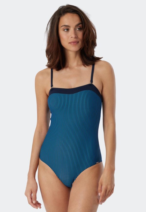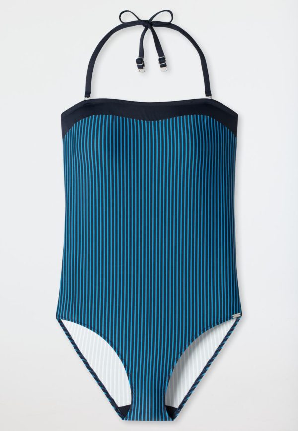 So elegant, so feminin: Dieser Bandeau-Badeanzug für Damen hat das gewisse Etwas! Klassische Streifen werden mit einem einfarbigen Band am Dekolleté hübsch abgesetzt. Der Einteiler aus elastischer, reycelter Microfaser ist zudem wunderbar flexibel: Die verstellbaren Träger können gerade, über Kreuz und als Neckholder gebunden – oder ganz abgenommen werden. Auf der Innenseite sorgen ein Silikonband und Softcups mit sanft stützendem Unterbrustband für optimalen Sitz. Beste SCHIESSER-Qualität!