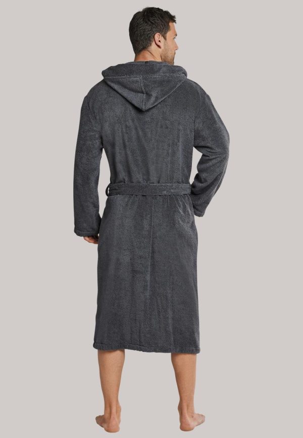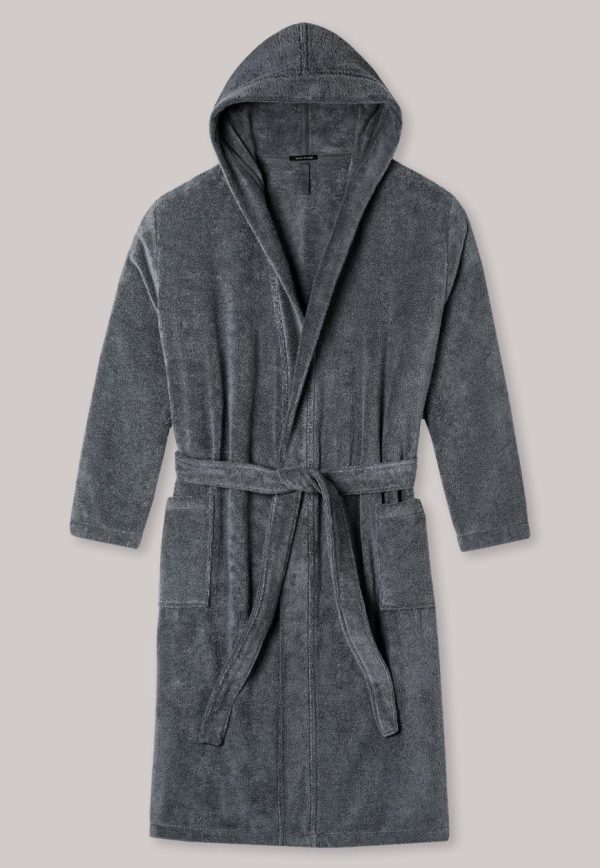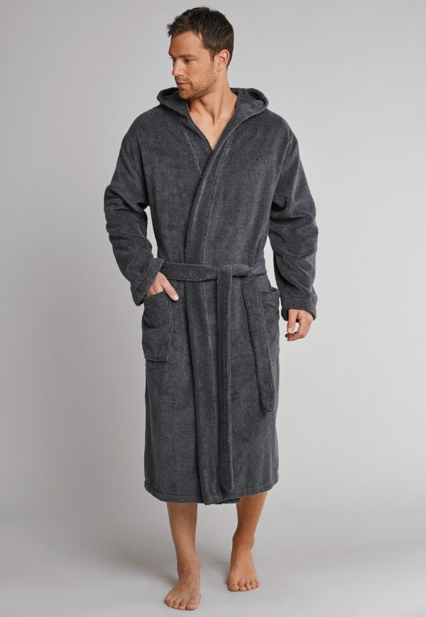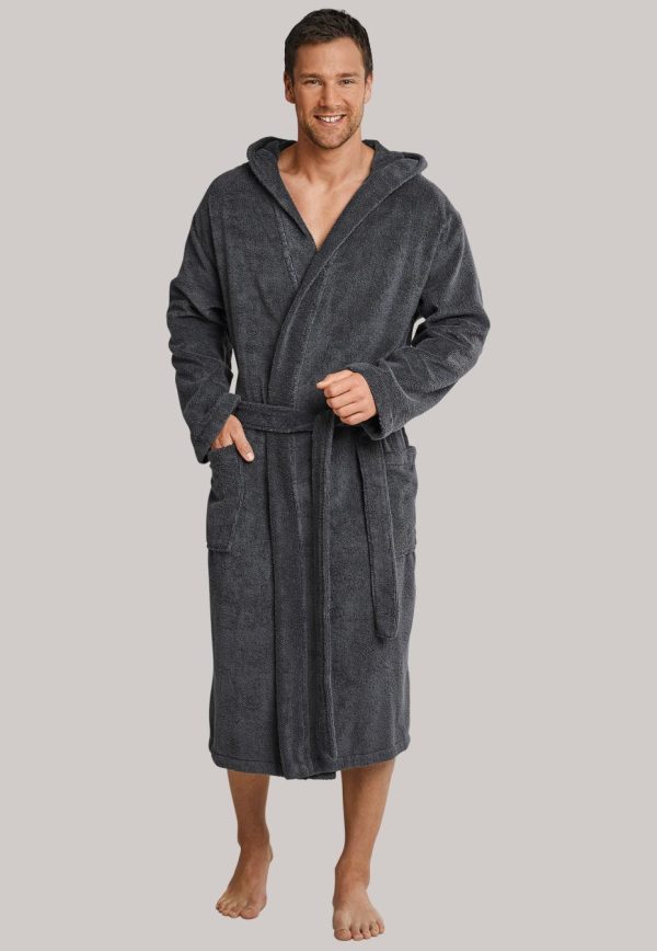 Dieser graue Bademantel schmeichelt anspruchsvollen Herren mit einem angenehm soften Material in bester SCHIESSER-Qualität. Hochwertiger Frottee aus 100% Baumwolle spendet dabei ein behagliches Gefühl auf der Haut und erhält mit der großen Kapuze, einem Bindegürtel und zwei aufgesetzten Taschen stimmige Details. Der perfekte Begleiter nach einem entspannten Vollbad, dem Sauna-Gang oder zum duftenden Kaffee und Tageszeitung am Morgen!