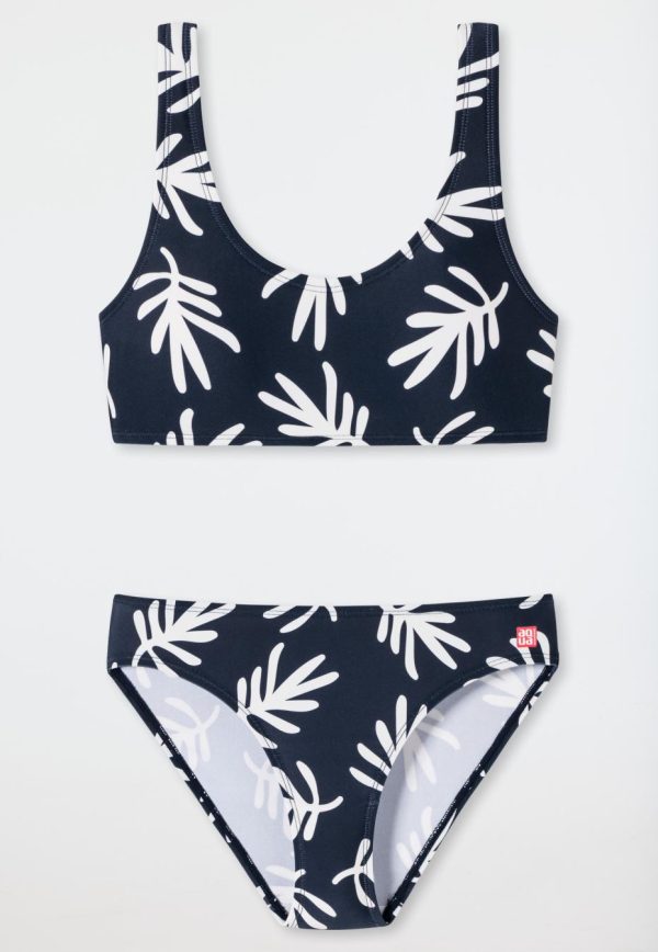 - Bustier-Bikini für Mädchen in Dunkelblau mit Allover-Muster aus weißen Palmenblättern