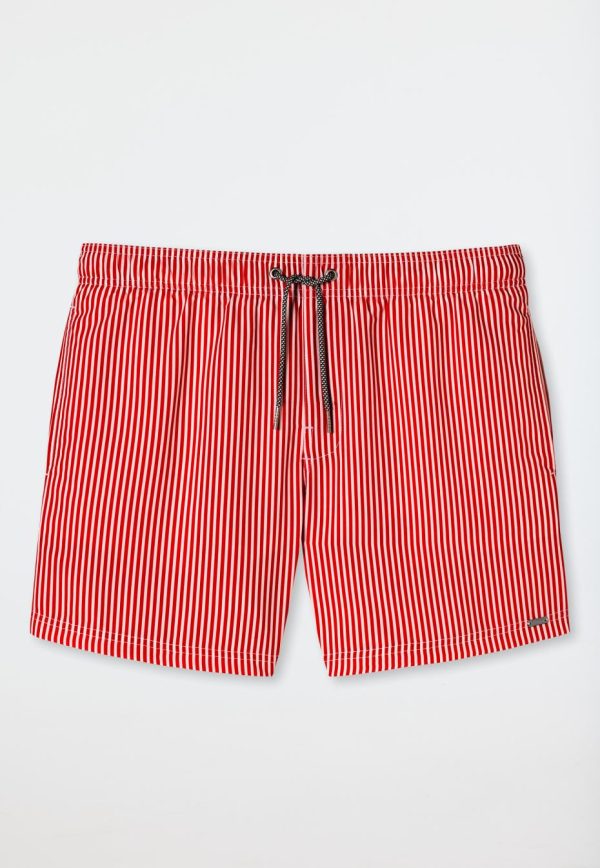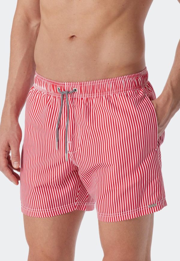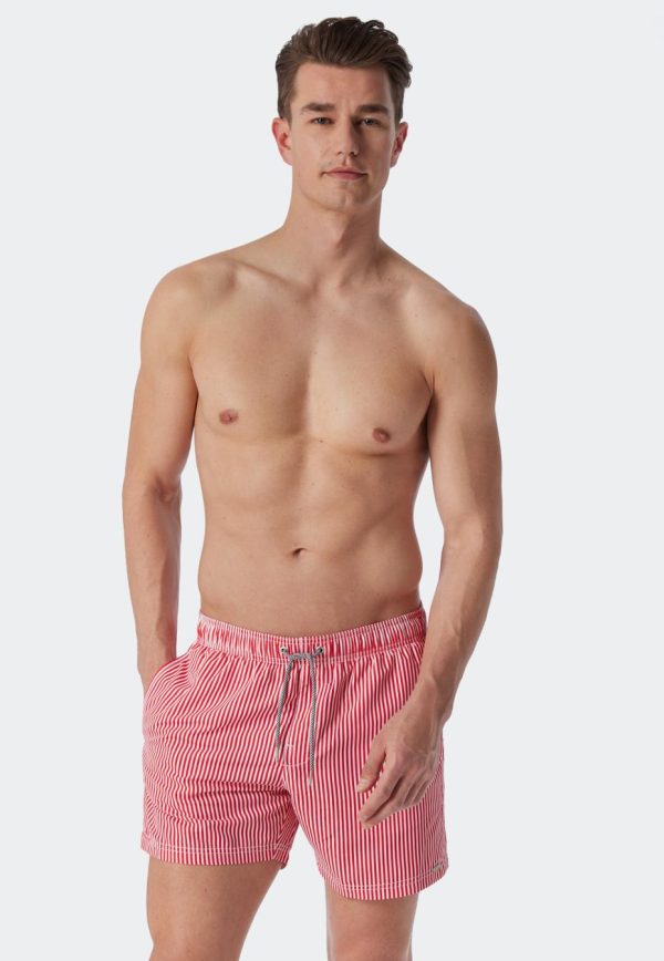 In diesen lässigen, gestreiften Swimshorts können sich Herren sehen lassen! Hergestellt aus hochwertiger Webware haben sie einen elastischen Bund, der mit einer weißen Bindekordel perfekt auf jede Taille einstellbar ist. Gemeinsam mit den seitlichen Taschen, kurzen Schlitzen am Saum und einem innen liegenden Mesh-Slip ist jede Menge Bewegungsfreiheit garantiert. Genau die richtigen Badeshorts für einen schönen Tag im kühlen Nass – natürlich in bester SCHIESSER-Qualität!
