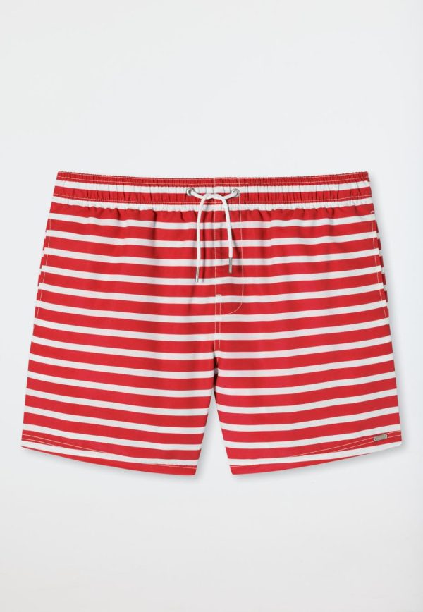 Der Sommer kann in diesen lässigen Herren-Swimshorts kommen! Ein rot-weißes Streifenmuster macht die Shorts zum Hingucker. Hergestellt aus hochwertiger Webware haben sie einen elastischen Bund, der mit einer Bindekordel perfekt auf jede Taille einstellbar ist. Mit den seitlichen Taschen, Schlitzen am Saum und einem innen liegenden Mesh-Slip ist jede Menge Bewegungsfreiheit garantiert. Ideal für einen schönen Tag im kühlen Nass – natürlich in bester SCHIESSER Qualität!