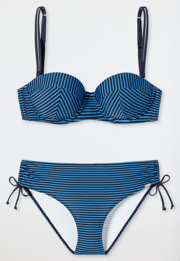 Tolle Farben und ein wunderschönes Design: Dieser Bandeau Bügel-Bikini in Streifen-Optik ist das Must-Have für den Sommer! Das gefütterte Top mit Softcups bringt ihr Dekolleté zur Geltung. Mit seinen verstellbaren Trägern kann es flexibel getragen werden: über Kreuz, gerade, als Neckholder oder ganz ohne. Auch der Midi-Slip lässt sich an den Seiten variabel einstellen. Das Material aus recycelter Microfaser ist dabei soft und umweltfreundlich. Swimwear in bester SCHIESSER-Qualität!