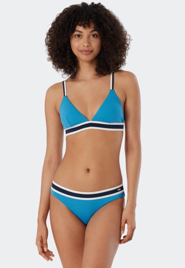 So sportlich und doch so feminin: Dieser gefütterte Triangel-Bikini in Ripp-Optik begeistert mit seinem Retro-Chic! Das Top sieht mit dem gestreiften Unterbrustband und den Trägern einfach gut aus! Die Trageweise ist variabel: Die Softcups lassen sich herausnehmen, die verstellbaren Träger können über Kreuz oder gerade eingestellt werden. Auch der Mini-Slip mit dem dunkelblau-weißen Band ist herrlich lässig. Das nachhaltige Material liegt dabei weich auf der Haut. Beste SCHIESSER-Qualität!