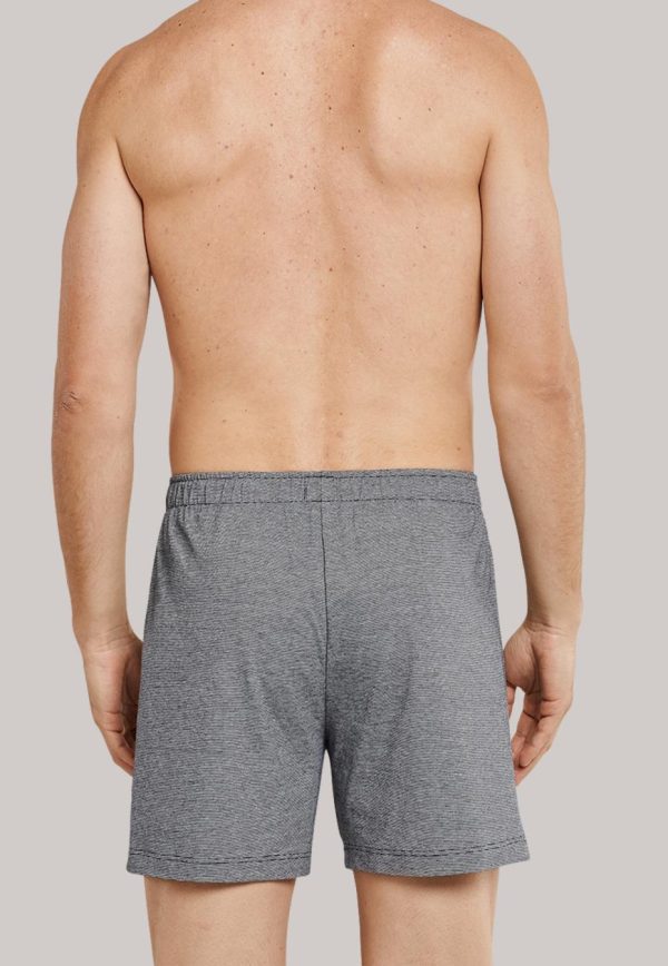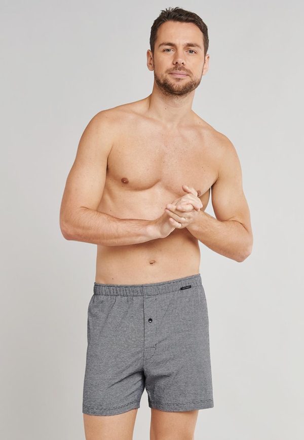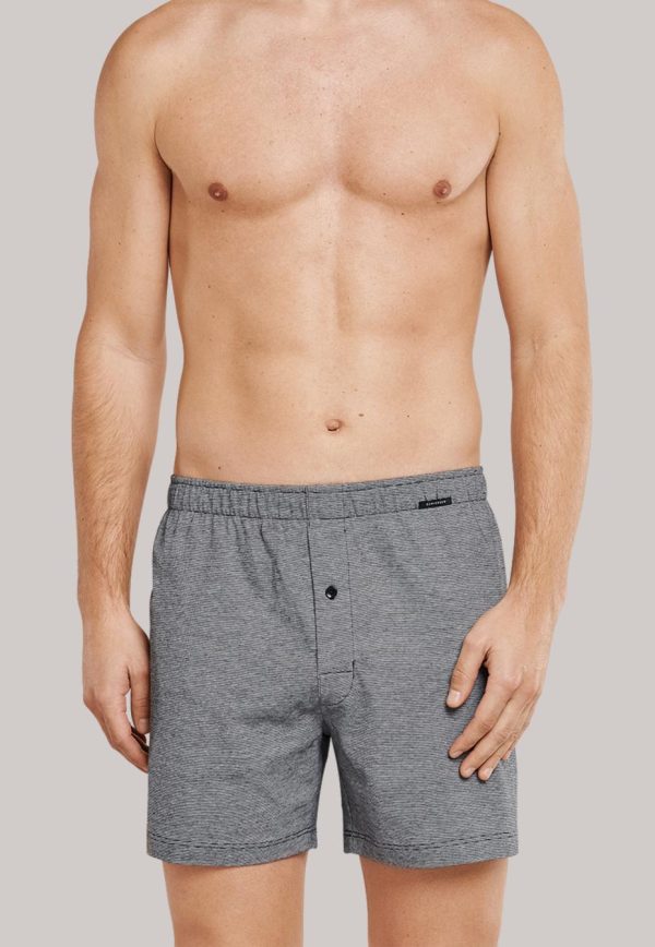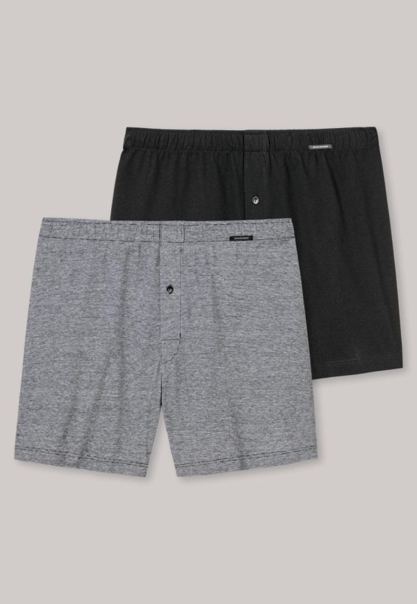Bei diesen beiden Herren-Boxershorts trifft ein lässiger Look auf feinen Single Jersey aus 100% Baumwolle. Klassische schwarze und weiße Töne zeigen sich in einem Modell mit dezenten Ringeln, das zweite Mal in der schwarzen Uni-Variante. Die Knopfleiste mit sichtbarem Knopf setzt ein funktionales Detail, der elastische Mehrnadelbund sorgt den ganzen Tag über für hohen Tragekomfort und Formstabilität. Ein maskuliner und moderner Wäsche-Doppelpack in bester SCHIESSER-Qualität!