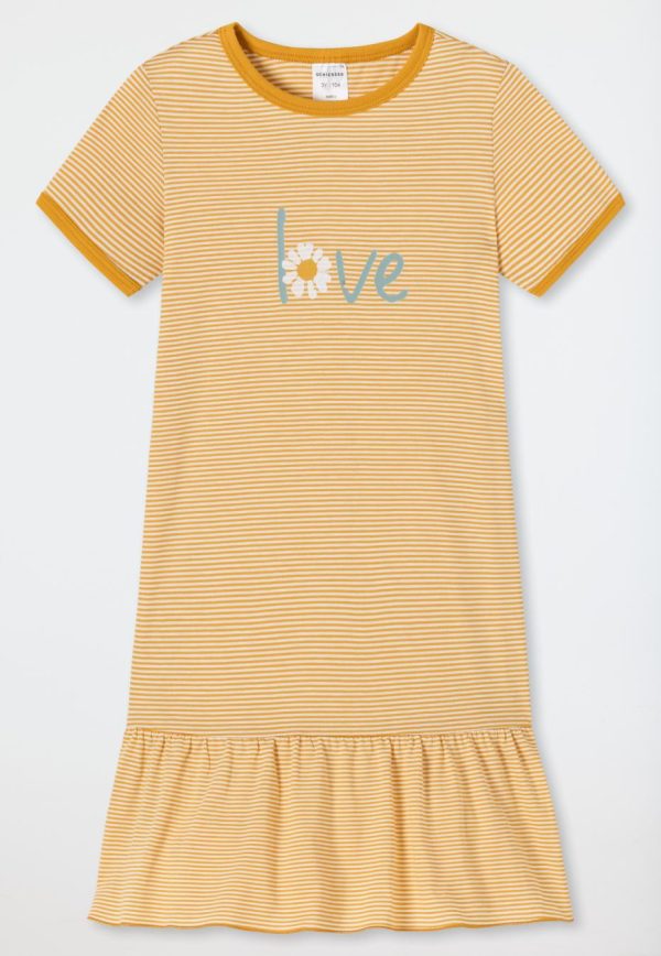 Aufgepasst, ihr kleinen Traumtänzerinnen – dieses hübsche Kurzarm-Nachthemd in strahlend Gelb ist einfach nur zuckersüß! Der fröhliche Ringel-Look und Volant sorgen für jede Menge gute Laune beim Zubettgehen. Auf der Brust wird ein toller „love“Schriftzug samt großer Margariten-Blüte zum echten Hingucker. Das natürliche Material in Baumwoll-Bamboo-Qualität ist besonders atmungsaktiv und garantiert auch in warmen Sommernächten entspannte Träume. Rundum bequem in bester SCHIESSER-Qualität.