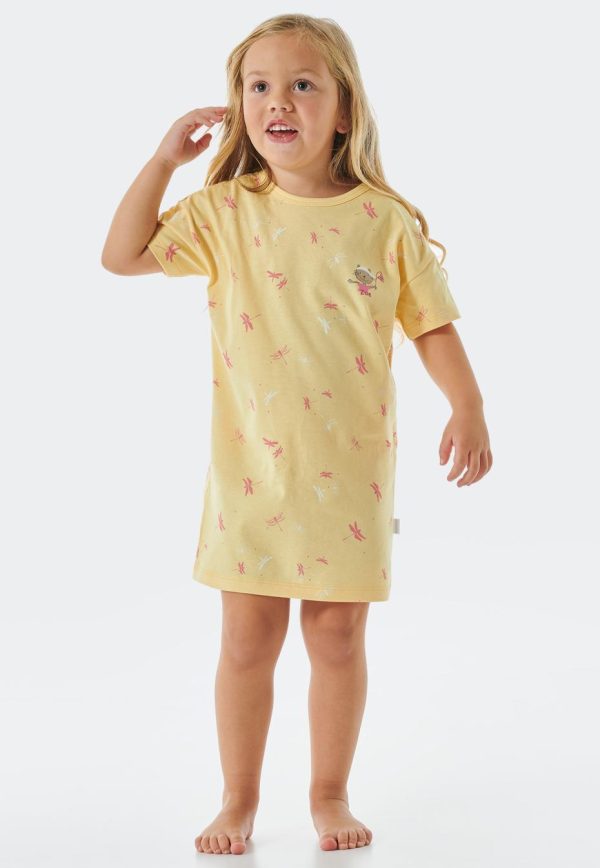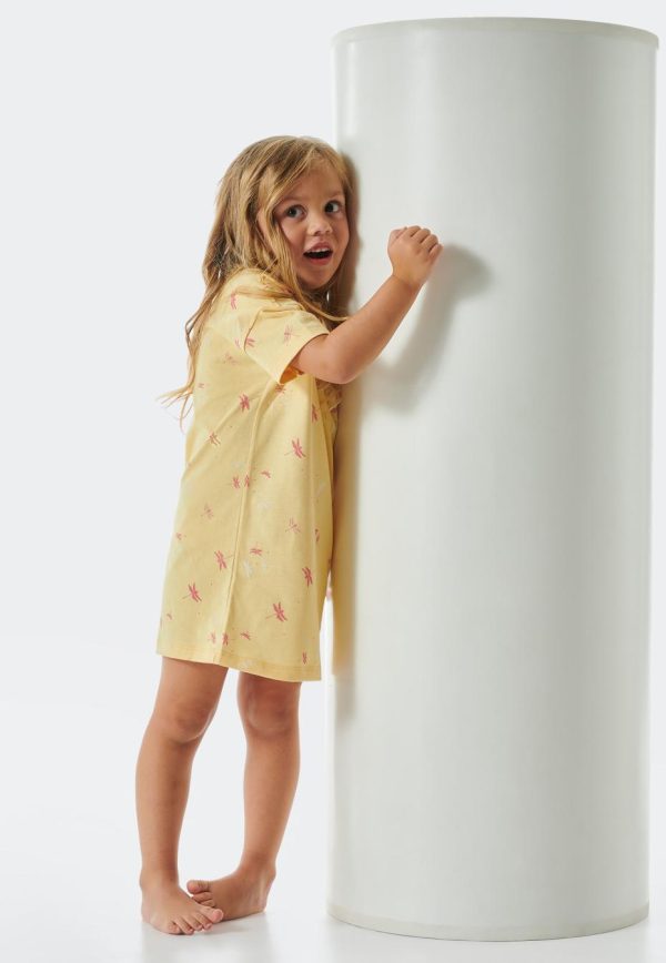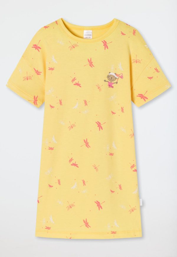 Einfach natürlich und herrlich verspielt ist dieses hübsche kurze Mädchennachthemd! In einem zarten Vanille-Ton und einem Allover-Muster aus kleinen Libellen sieht das Sleepshirt rundum entzückend aus. Ein echter Hingucker auf der Brust ist unsere Lieblingskatze Zoe, die freudestrahlend Sommerlaune verbreitet. Das weiche Single Jersey-Material aus 100% Bio-Baumwolle schmeichelt der Kinderhaut und lädt zum Entspannen und Wohlfühlen ein. Traumhaft schön in bester SCHIESSER-Qualität.