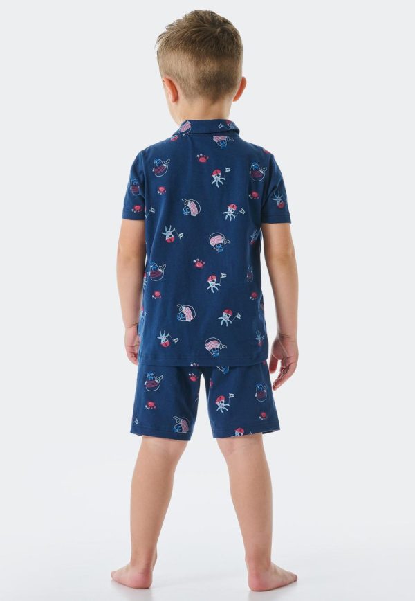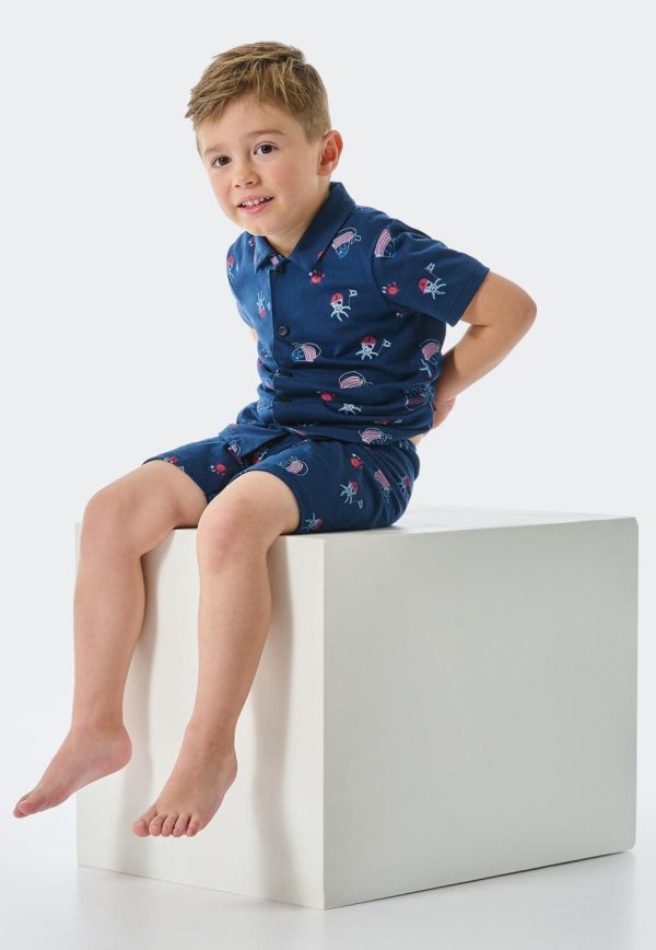 Dieser kurze, dunkelblaue Jungen-Pyjama garantiert entspannte Träume. Mit dem fröhlichem Allover-Muster aus wilden Tier-Piraten sieht der Zweiteiler nicht nur besonders fröhlich aus, sondern überzeugt zusätzlich mit pfiffigen Details: Die durchgehende Knopfleiste ist beim Anziehen besonders praktisch und dank softem Bund sitzen die Schlafshorts auch in der Nacht perfekt. Eine abenteuerlustige Nachtwäsche aus 100% hautfreundlicher Bio-Baumwolle und bester SCHIESSER-Qualität!