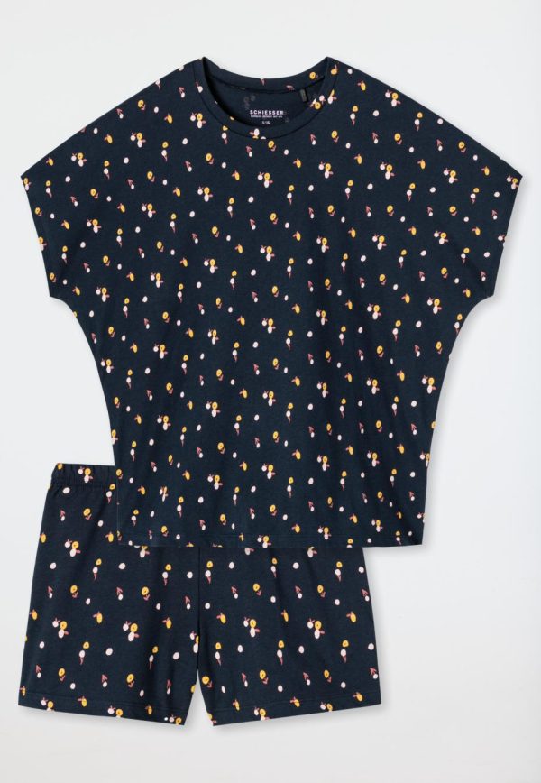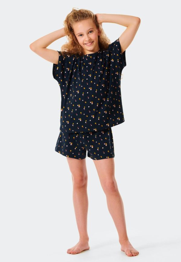 Ein kurzer, anthrazitfarbener Mädchen-Schlafanzug für coole Fashion-Queens! Das T-Shirt wird mit dem trendy Blümchen-Muster, dem Rundhalsausschnitt und der überschnittenen Schulter zum echten Hingucker. Die ebenfalls gemusterten Shorts runden den Look gekonnt ab und sind besonders bequem. Dank 100 % Organic Cotton und bester SCHIESSER-Qualität sind Sweet Dreams fast schon garantiert.