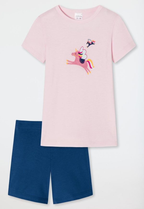 - kurzer Mädchenschlafanzug in Rosé mit Einhorn-Motiv und blauer Schlafhose