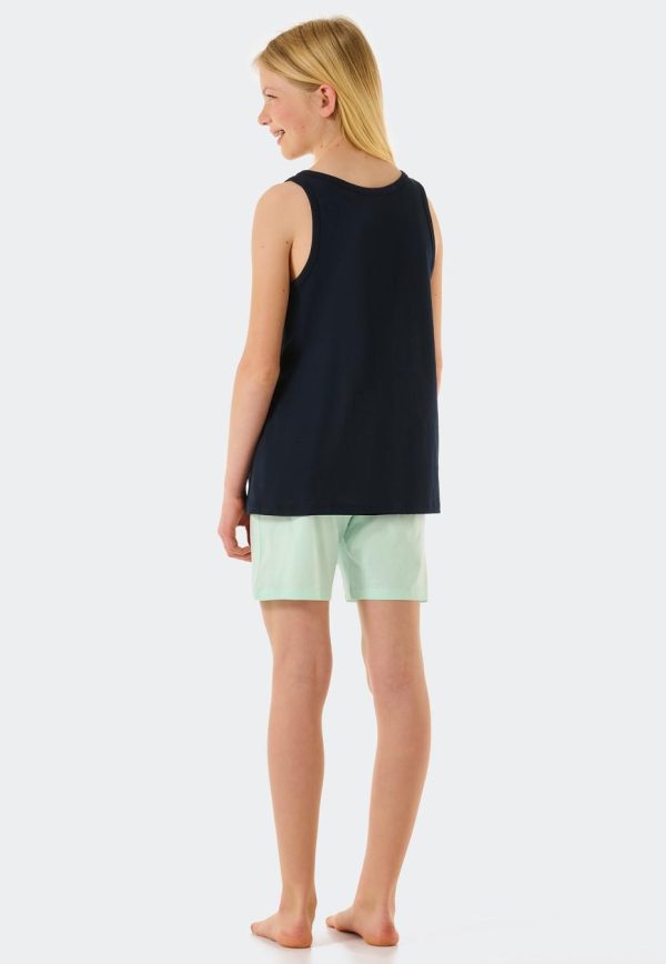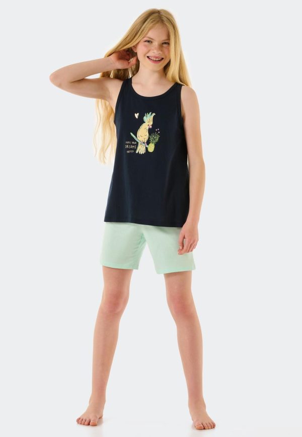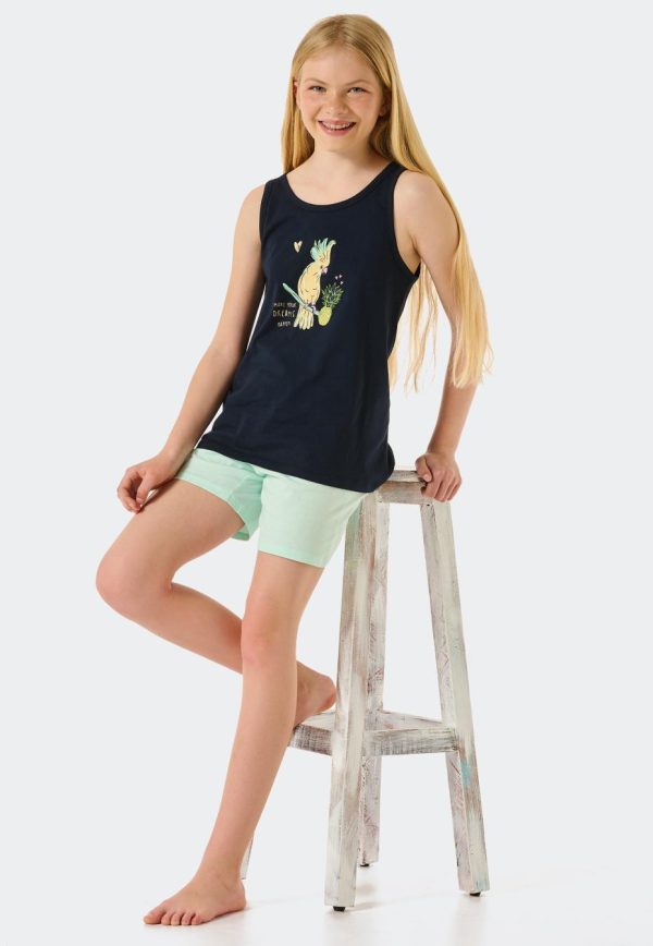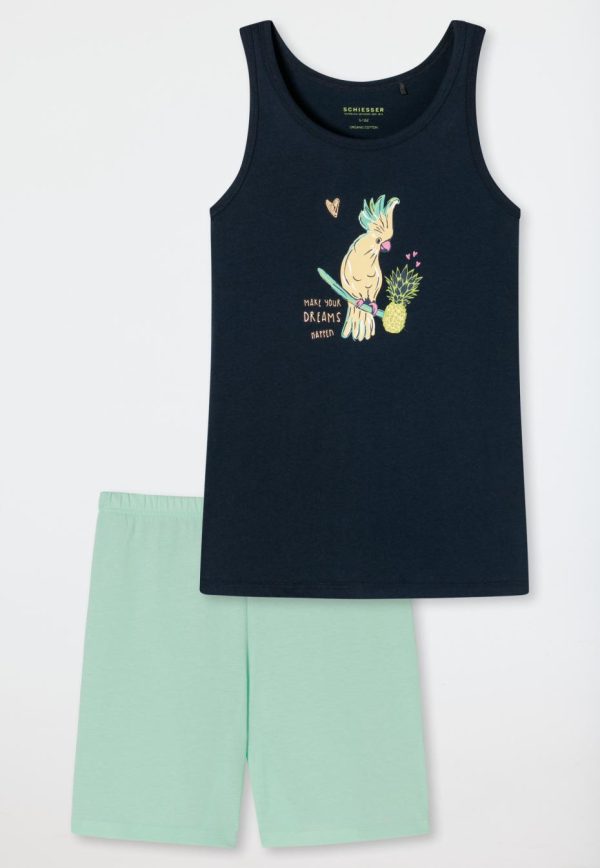 Dieser kurze Zweiteiler ist der perfekte Schlafanzug für Fashion-Queens! Mit dem sommerlichen Motiv-Mix aus Kakadu, Ananas sowie MAKE YOUR DREAMS HAPPEN-Schriftzug sieht das dunkelblaue Top mit den schmalen Trägern absolut trendy aus. Wunderbar bequem wird das Lieblingsstück dank der mintgrünen Shorts und softem Single-Jersey aus reiner Bio-Baumwolle. Beste SCHIESSER-Qualität gibt’s obendrein und natürlich unsere Süße-Träume-Garantie!