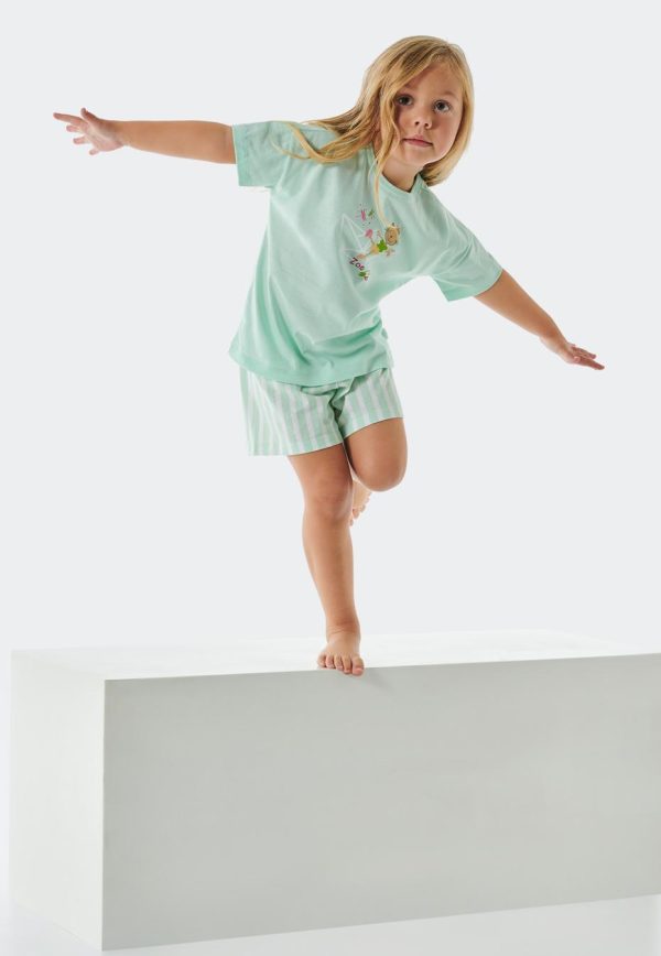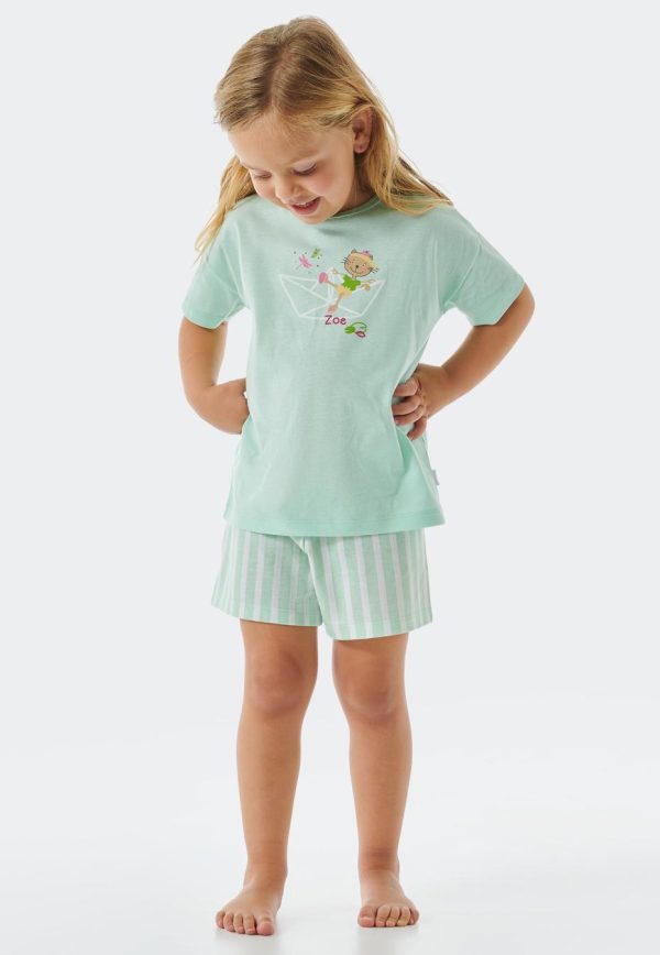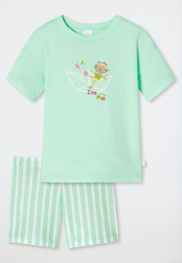 - kurzer Mädchenschlafanzug in Mint mit Papierboot-Motiv, Katzen-Motiv und gestreifter Schlafhose