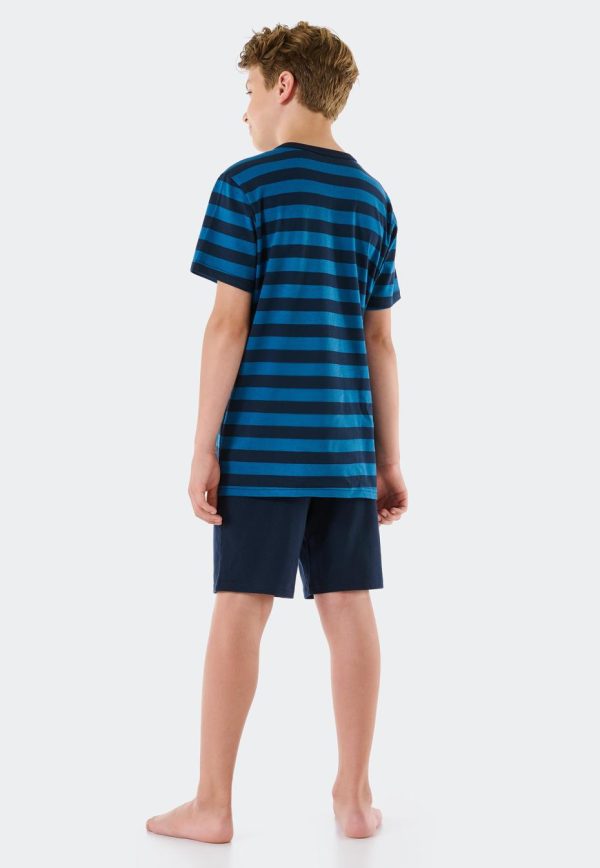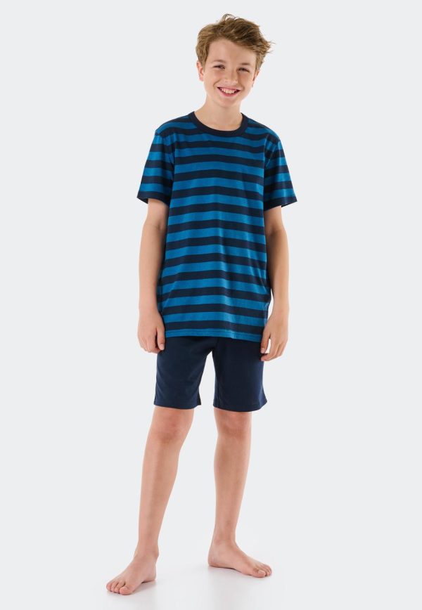 Dieser kurze Jungenschlafanzug aus 100 % Organic Cotton ist genau das Richtige für coole Boys, die es bequem mögen. In dem T-Shirt mit blau-schwarzen Ringeln lässt es sich wunderbar träumen und entspannen. Das passende Pendant findet sich in der schwarzen Shorts. Ein gemütlicher Zweiteiler in bester SCHIESSER-Qualität!