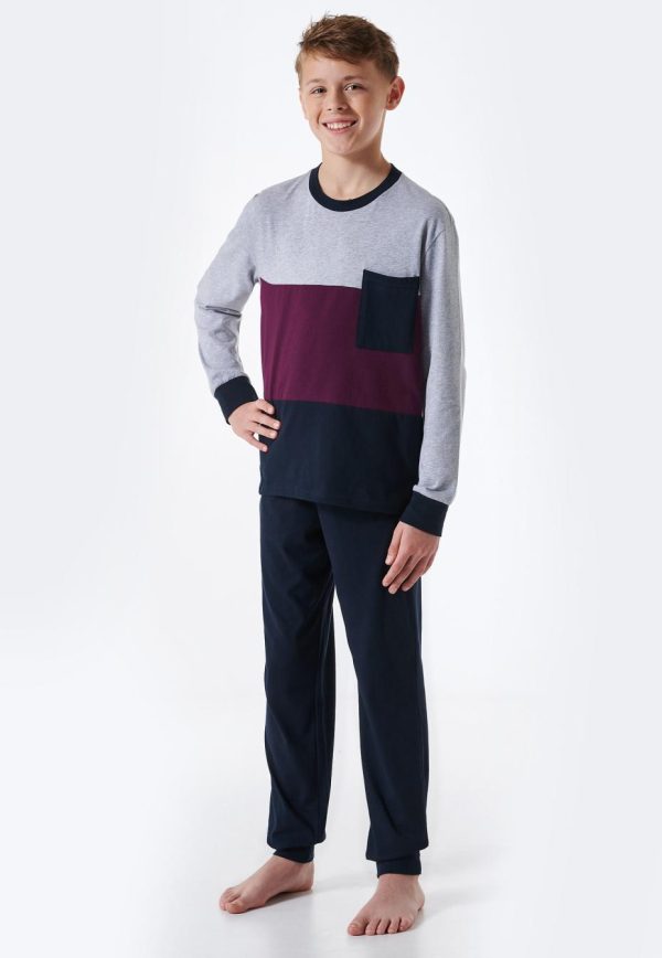 - langer Jungenschlafanzug mit geringeltem Langarmshirt in Grau-Melange, Aubergine und Nachtblau