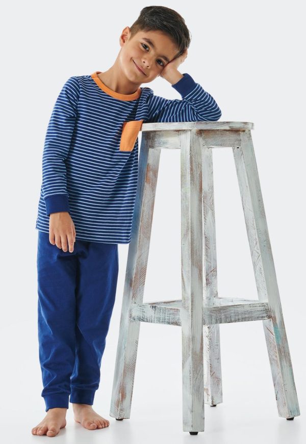 - langer Jungenschlafanzug in Hell- und Dunkelblau mit Rundhalsausschnitt und Brusttasche in Apricot