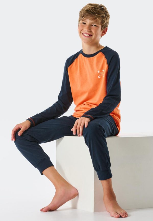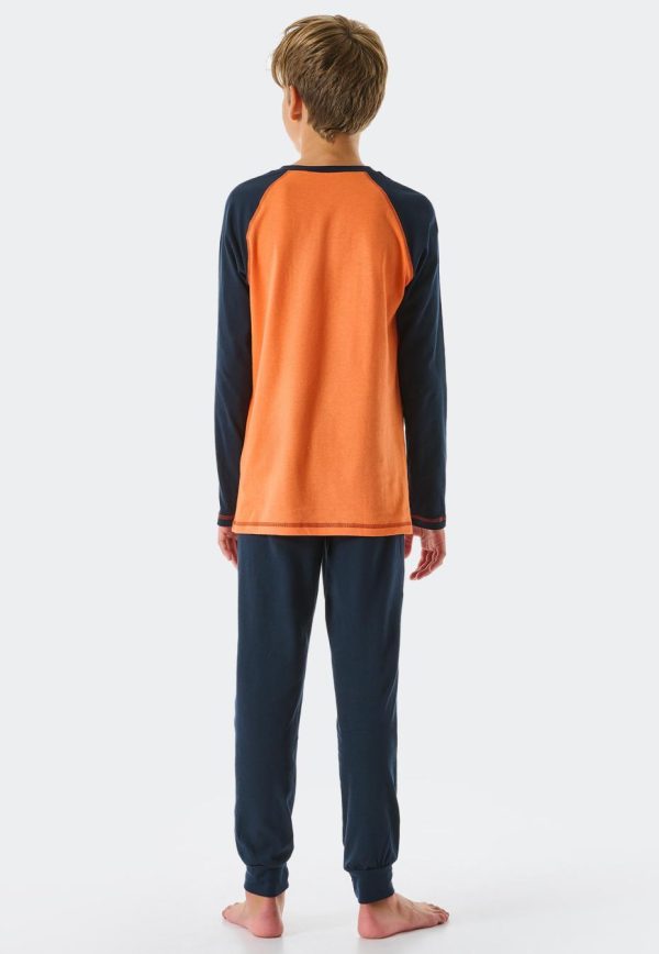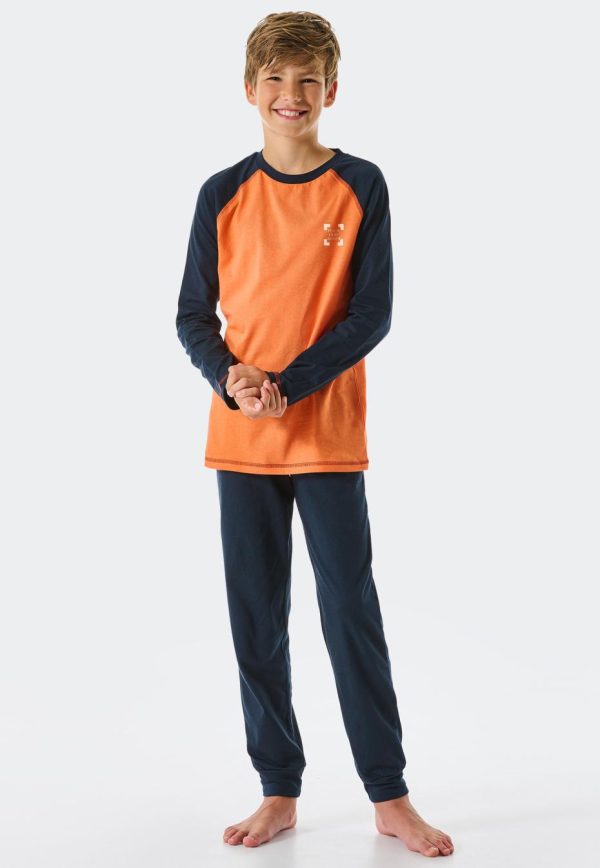 - orangefarbenes Langarmshirt mit eingefasstem Rundhalsausschnitt in Nachtblau und Print auf der Brust