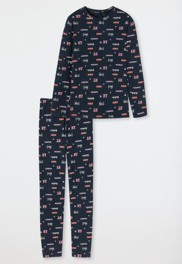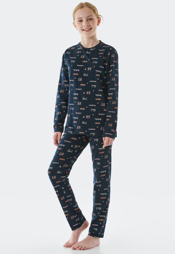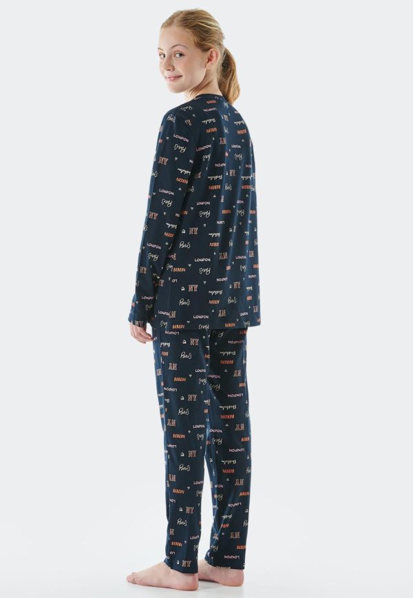 - langer, nachtblauer Mädchen-Schlafanzug mit mehrfarbigen Städtenamen