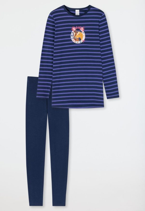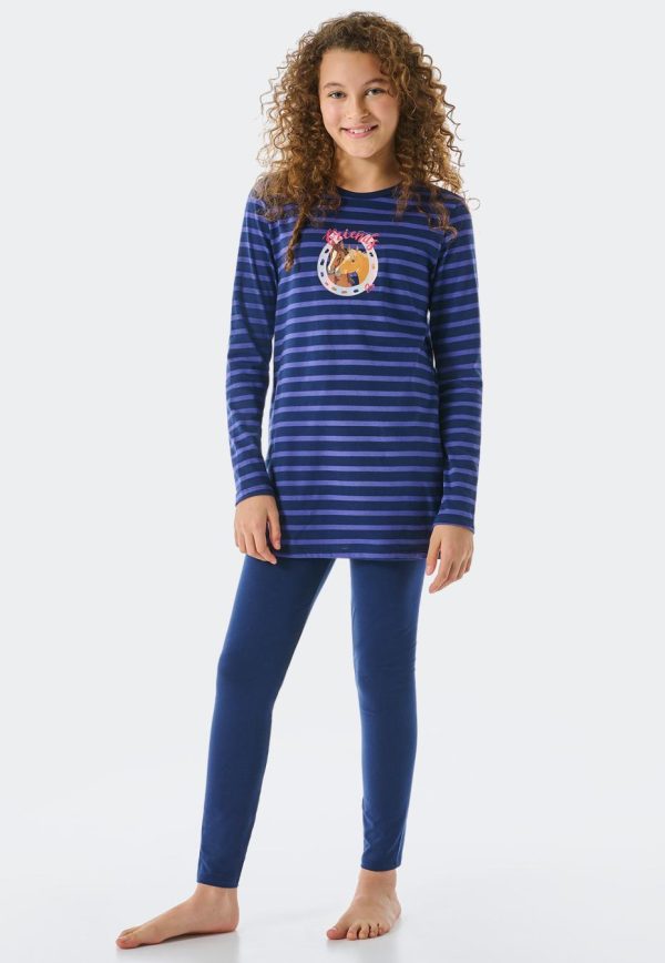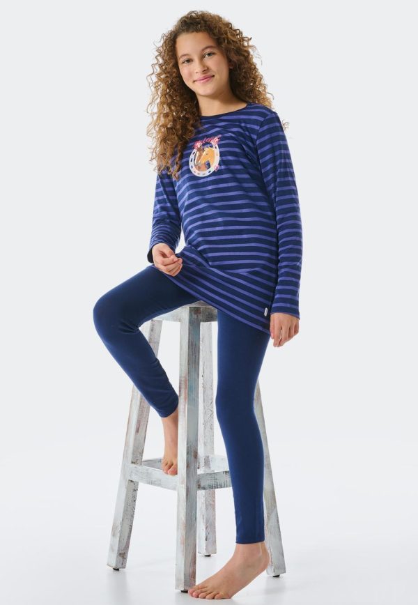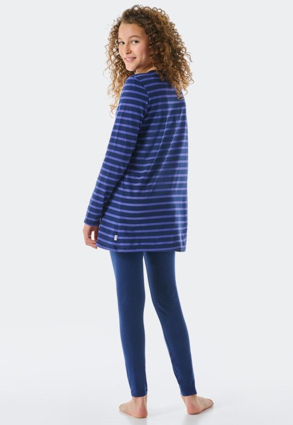 - langer geringelter Schlafanzug für Mädchen in Blau mit unifarbener Leggings