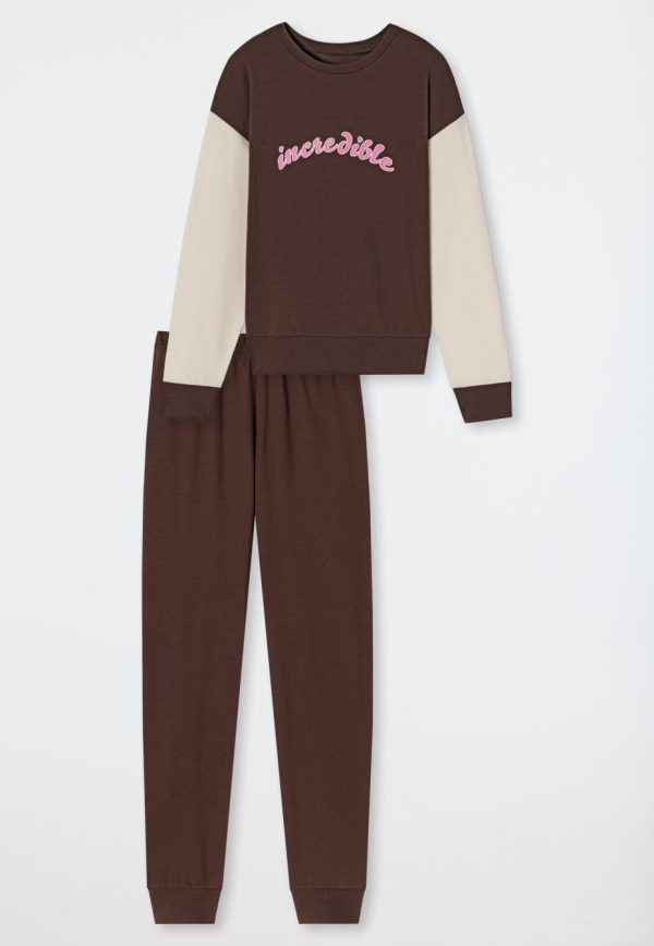 - langer, brauner Mädchen-Schlafanzug mit „incredible“-Schriftzug und weißen Ärmeln