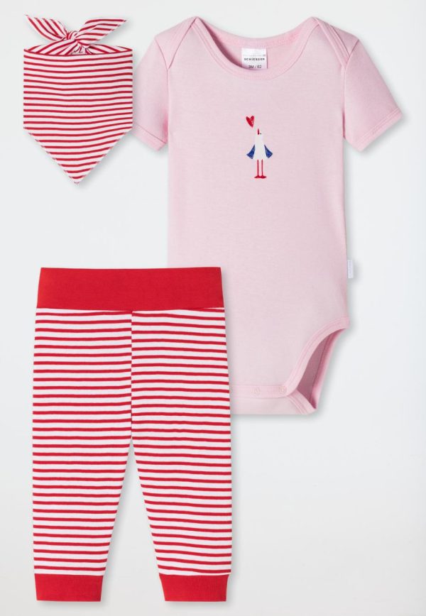 Dieses 3-teilige Babyset für Mädchen überzeugt im maritimen Look! Ob bei der nächsten Babyparty oder als süße Geschenk-Idee – diese Tagwäsche aus hochwertigem Feinripp mit 100% Organic Cotton lässt alle Herzen höher schlagen. Der rosafarbene Kurzarm-Body sieht mit dem Möwen-Motiv besonders süß aus und bekommt mit praktischen Druckknöpfen tolle Details. Die bequeme Bündchenhose in Rot und Weiß und ein passendes Halstuch im Streifen-Look runden das Wohlfühl-Trio ab. Beste SCHIESSER-Qualität!