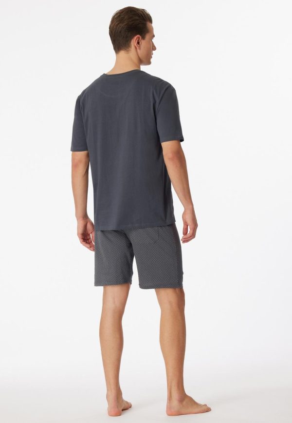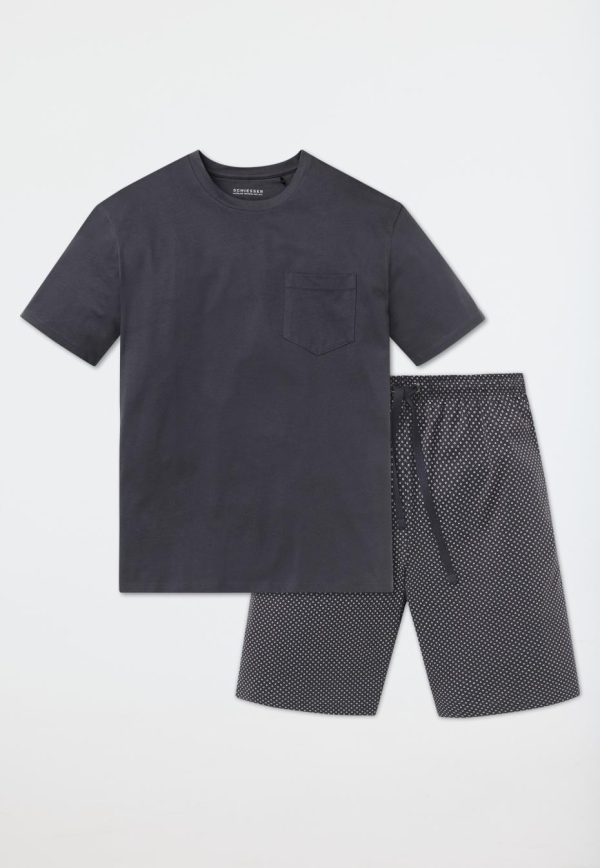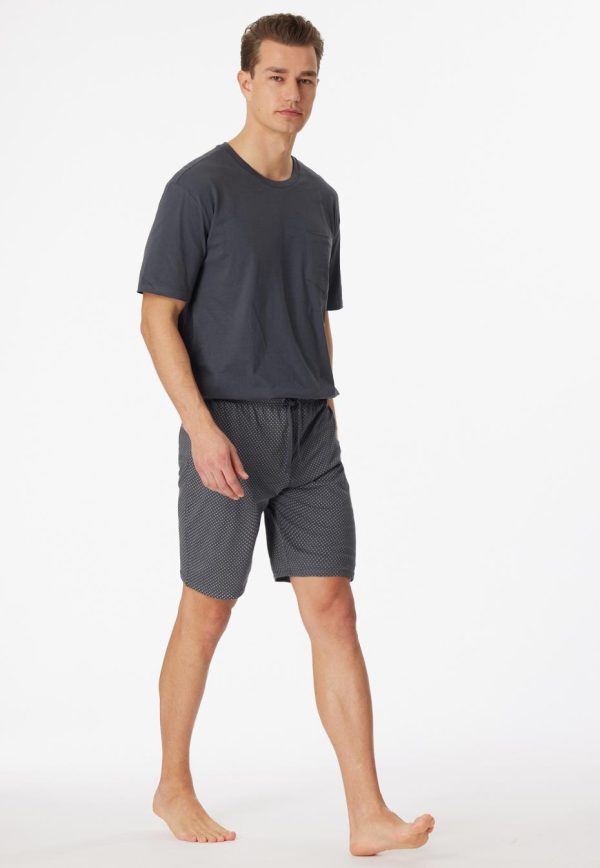Im stilvollen Look und 100% weicher Baumwolle überzeugt dieser kurze, graue Schlafanzug anspruchsvolle Herren. Das Oberteil mit Rundhals-Ausschnitt und Brusttasche bekommt mit der kurzen Hose mit weißem Kreis-Alloverprint einen starken Partner, der mit einem Bindeband am Hosenbund und der Gesäßtasche dezente Details mitbringt. Locker-leichter Single Jersey übernimmt den komfortablen Part und verspricht angenehme Nächte in bester SCHIESSER-Qualität!