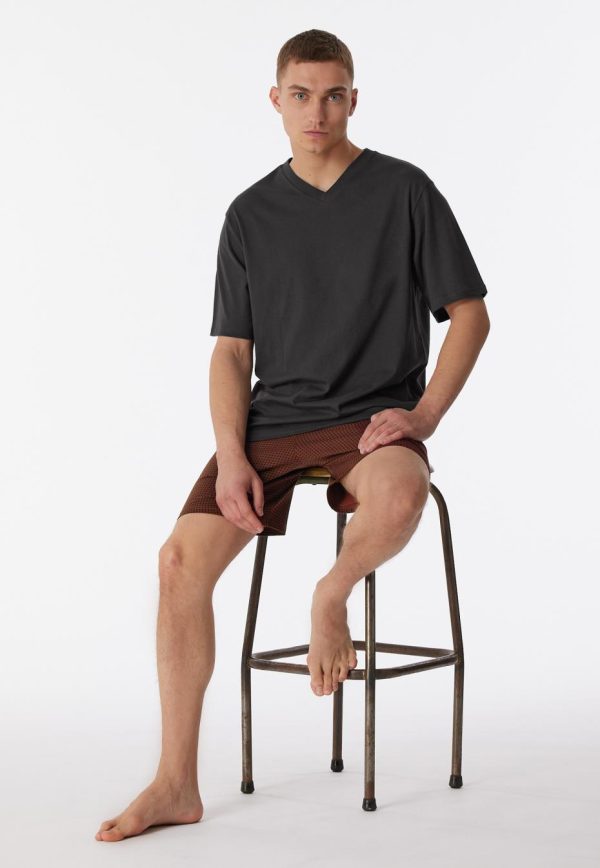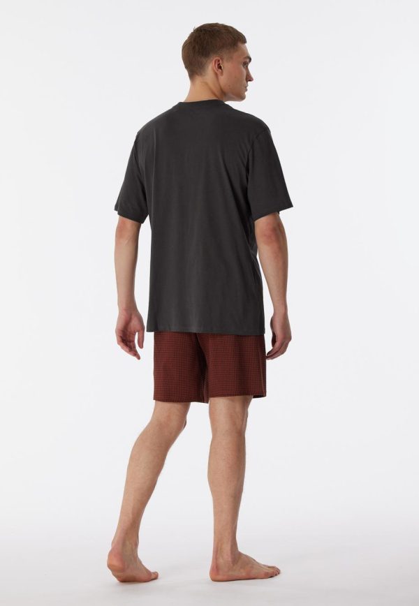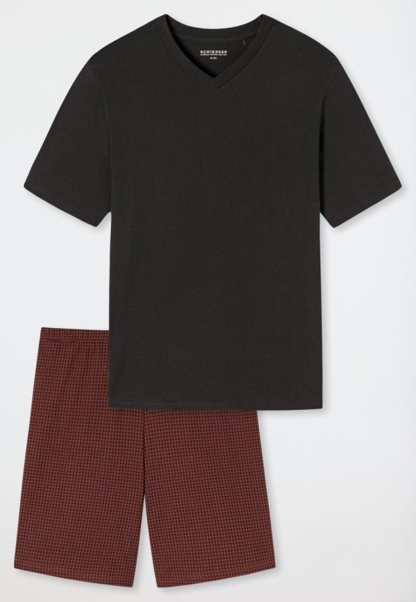 - kurzen Herren-Schlafanzug mit anthrazitfarbenem T-Shirt und gemusterten Shorts in Dunkelgrau und Rot