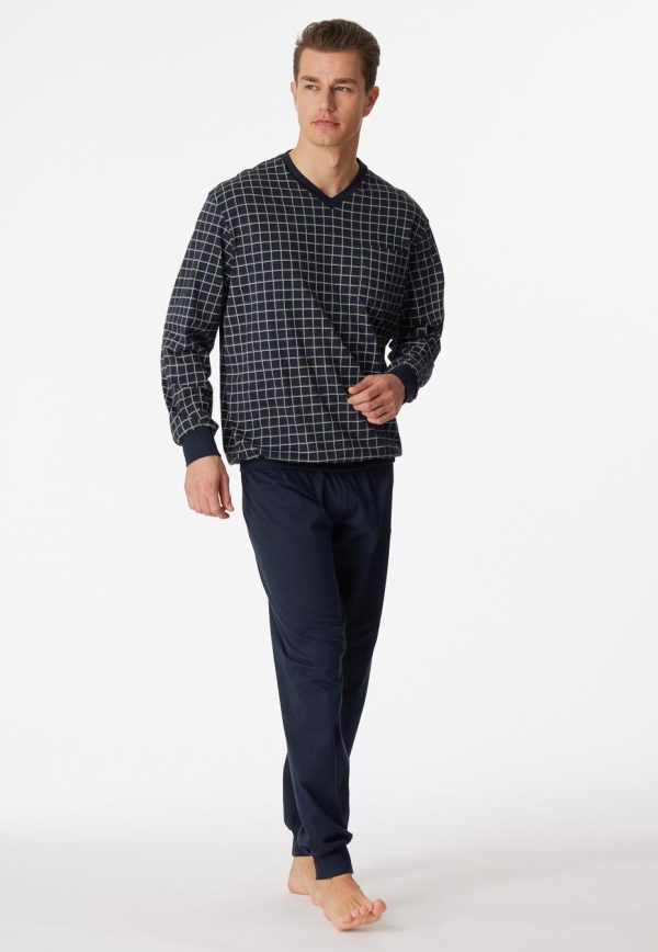 Hoher Tragekomfort steht ganz im Fokus dieses langen, dunkelblauen Schlafanzugs für Herren. Feiner Jersey aus 100% Baumwolle fühlt sich dabei angenehm weich an und wird mit den Bündchenabschlüssen stimmig abgerundet. Und auch optisch kann der Zweiteiler punkten: Weiß-blaue Karos schenken dem Oberteil einen maskulinen Charakter und bekommen mit der aufgesetzten Brusttasche ein feines Details. Genau das Richtige für Herren, die auch nachts nicht auf beste SCHIESSER-Qualität verzichten möchten!