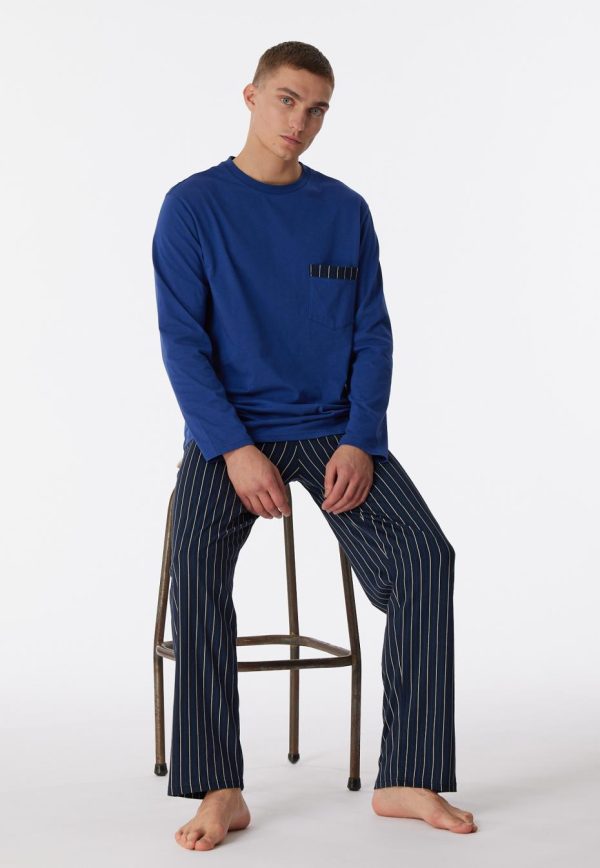 - langer, navyfarbener Herren-Schlafanzug mit gestreifter Hose in Navy, Royalblau und Off-white