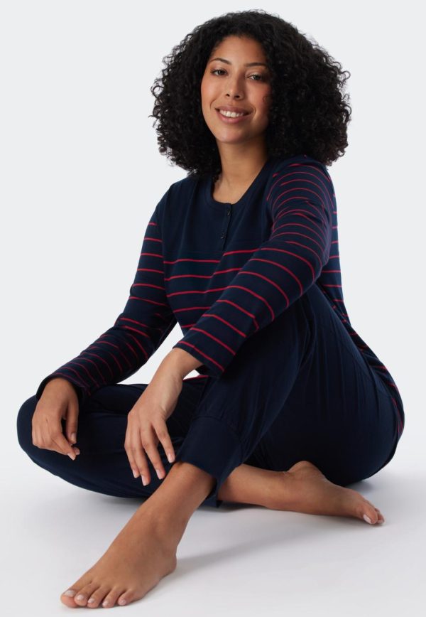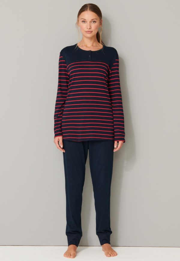 - langer Schlafanzug für Damen mit nachtblau-rot-geringeltem Shirt und nachtblauer Hose