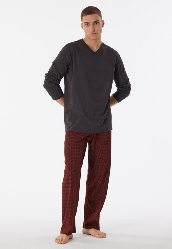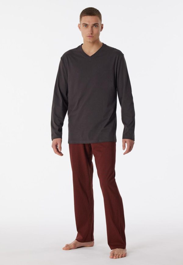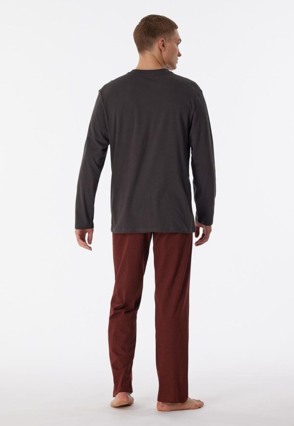 - langer Herren-Schlafanzug mit anthrazitfarbenem Langarmshirt und gemusterter Hose in Dunkelgrau&Rot
