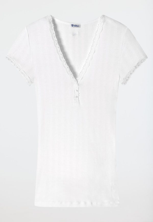 Die Liebliche! Die Revival Wäscheserie Agathe ist seit jeher unser femininer Klassiker. Charakteristisch für die Shirts, Chemisettes oder Pants sind die geblümte Bandspitze, echte Perlmuttknöpfe und der feingerippte Ajouré-Stoff. So hübsch, dass sich die Oberteile auch als Oberbekleidung gut machen. So geht eleganter Retro!