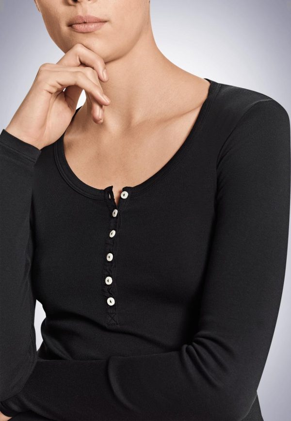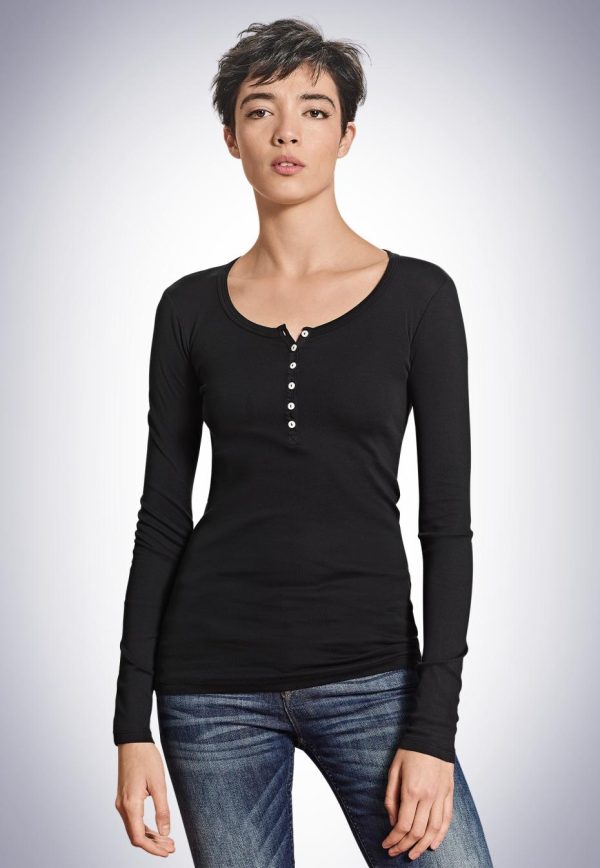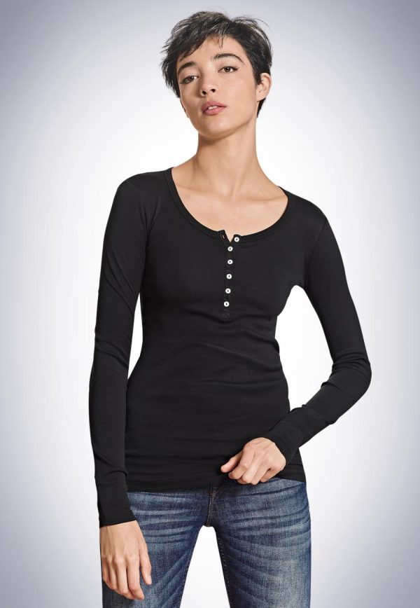 Berta – die Sportive. Ich bin ein Damen-Langarmshirt, das nicht fehlen darf. Schlicht, cool, unkompliziert. Ich sitze nah an deinem Körper und schmeichle dir mit softem Feinripp aus Zwirn, 100% beste Baumwolle. Die lange Knopfleiste mit echten Perlmuttknöpfen schenkt mir den typischen Henley-Charakter. Ob als Wäsche, zur Denim oder als coole Loungewear, ich mache jederzeit eine gute Figur.