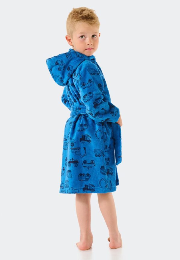 - blauer Bademantel für Jungen mit Muster aus verschiedenen Fahrzeugen in Dunkelblau