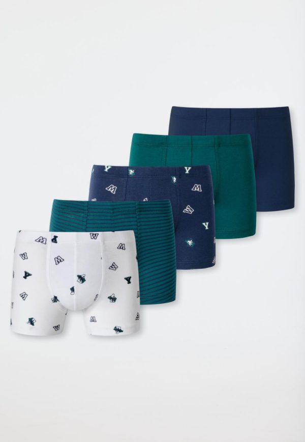 - Jungenshorts in Dunkelblau und Dunkelgrün, geringelt und in Weiß und Dunkelblau mit College-Allover