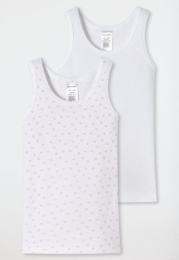 Einfach bezaubernd! Diese beiden Mädchen-Unterhemden sorgen gleich im Doppelpack für richtig gute Laune. Das hochwertige Feinripp-Material aus 100% Organic Cotton fühlt sich besonders weich und angenehm auf der empfindlichen Kinderhaut an. Ob in Weiß mit süßen rosa Punkten oder ganz in Weiß – dieses Tagwäsche-Duo garantiert ein herrliches Tragegefühl und ganz viel Komfort. Für unsere Schätze nur das Beste in natürlicher SCHIESSER-Qualität!